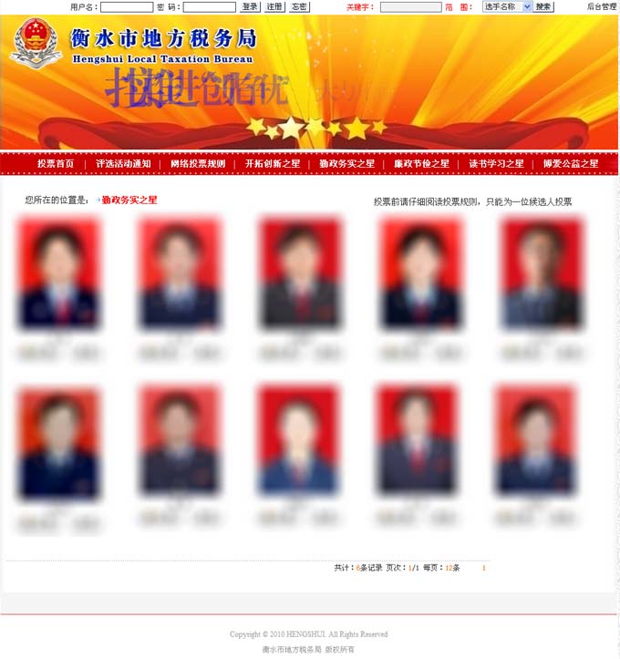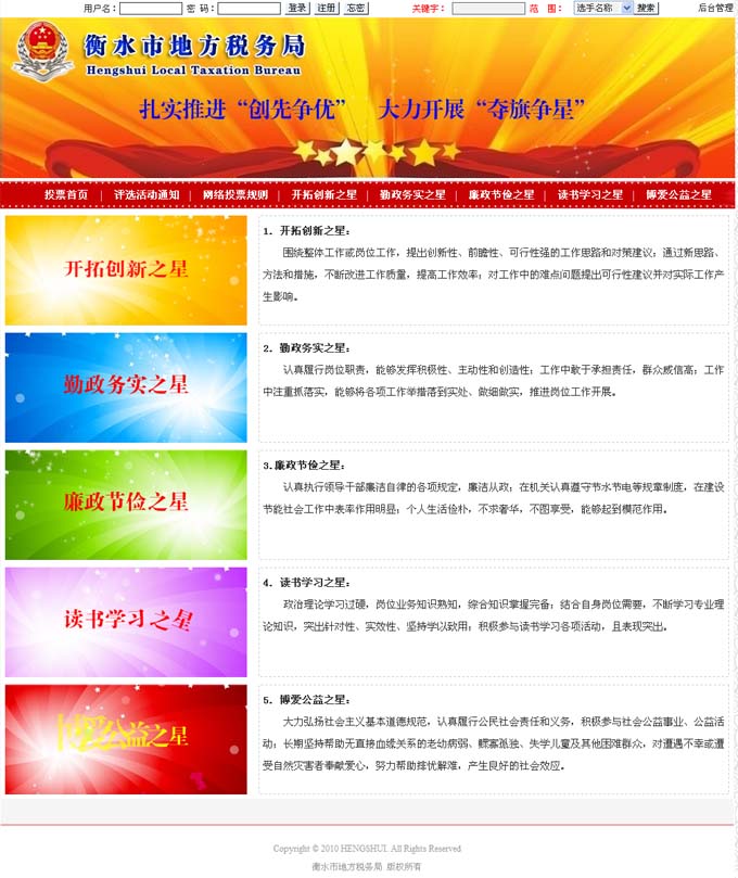 衡水起航網(wǎng)絡(luò)科技有限公司承接了此次人物評選投票活動(dòng)的網(wǎng)絡(luò)投票程序任務(wù)。經(jīng)過三個(gè)日夜的緊張測試,網(wǎng)絡(luò)投票系統(tǒng)已在地稅局內(nèi)網(wǎng)正式上線,投票將于18日上午9:00開始,此次“季度之星”評選共設(shè)置“開拓創(chuàng)新之星”、“勤政務(wù)實(shí)之星”、“廉政節(jié)儉之星”、“讀書學(xué)習(xí)之星”、“博愛公益之星”五個(gè)類別,每個(gè)類別最終產(chǎn)生“季度之星”1名。