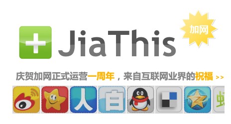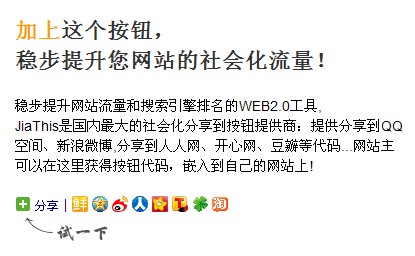 JiaThis是國內最大的社會化分享到按鈕提供商:提供分享到QQ空間、新浪微博,分享到人人網、開心網、豆瓣等代碼...網站主可以在這里獲得按鈕代碼,嵌入到自己的網站上!