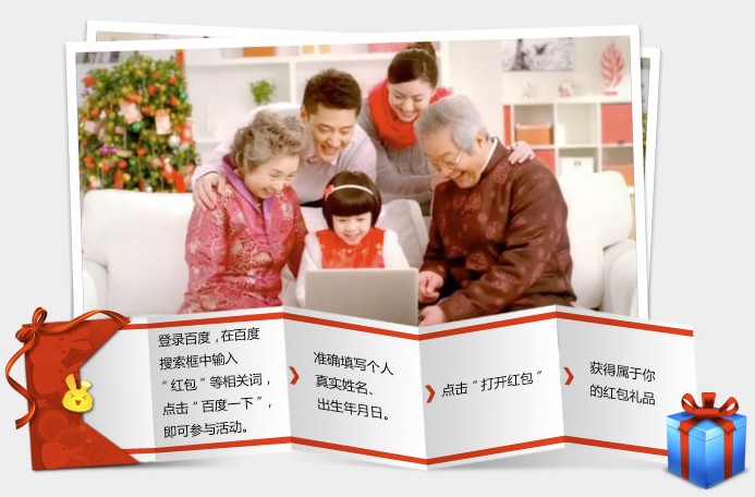 百度投入數(shù)千萬元打造的此次真正零門檻,人人有驚喜的搜紅包活動,將掀起一股強勁的互聯(lián)網(wǎng)應(yīng)用體驗浪潮。在百度春節(jié)專題頁面上(http://chunjie.baidu.com)特別設(shè)置的新網(wǎng)民課程,春節(jié)相關(guān)的框計算應(yīng)用體驗,百科知道春節(jié)知識集錦等,將讓新老網(wǎng)民的春節(jié)生活別樣精彩。可以說,此次大規(guī)模、高投入的互聯(lián)網(wǎng)普及活動,兼具了讓更多人接觸互聯(lián)網(wǎng)、開啟網(wǎng)絡(luò)時代生活的特殊價值和意義。